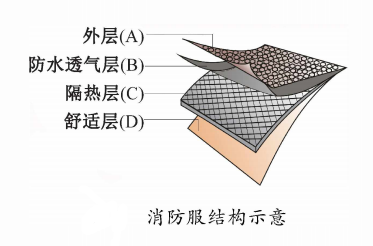 消防服由外層(A )、防 透 氣 層 (B )、隔熱層 (C)、舒適層(D)等層復(fù)合而成。阻燃性是外層 的基本要求;防透氣層的作用主要是防或有害物質(zhì)滲入,并將人體產(chǎn)生的汗液和濕氣及時排出;隔熱層要求具備良好的隔熱、防熱輻射性;舒適層提供與人體接觸的舒適性。多層織物復(fù)合形成消防服,需提供的主要性能是整體熱防護性、透水蒸氣性和舒適性。